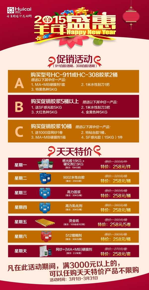 广州辉彩特殊印花材料公司在羊年为回馈广大新老客户,在2015年开年的03月01日至3月31日这段时间,印花材料将天天特价回馈新老客户,这次活动才刚刚开始就得到了不少客户的高度赞誉,同时为辉彩印花材料在这印花行业内的名声也大为广传,并高度认可了辉彩印花材料产品的质量,为感谢新老客户的高度支持,辉彩印花材料以后会推出更多实惠高品质的产品。关注更多的优惠活动,请关注辉彩微信公众号:hchg168;或登录辉彩官网:hchg168.com;