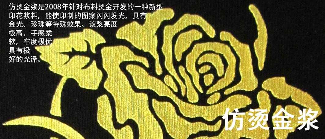 仿烫金浆 /热固油墨 /厚版浆 /防升华胶浆 /裂纹浆 /彩拔浆 /洗水牛仔浆 /仿拔印浆 /绒面效果浆 /彩色热固油 /更多+印染印花助剂 >>