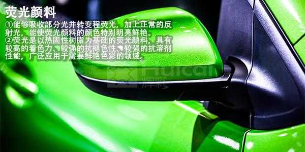 荧光颜料是以热固性树脂为基础的荧光颜料,具有较高的着色力、较强的抗褪色性、极细的粒径、及较强的抗溶剂性能。辉彩荧光粉与一般颜料不同,它可将吸收的部分光(包括紫外光)转变成波长更长的且与正常反射光色调相近的光——荧光,放射出来,这种荧光加上正常的反射光,使荧光颜料的颜色特别明亮和鲜艳
