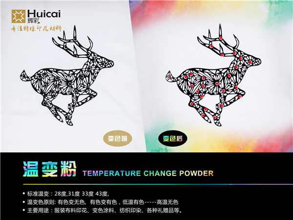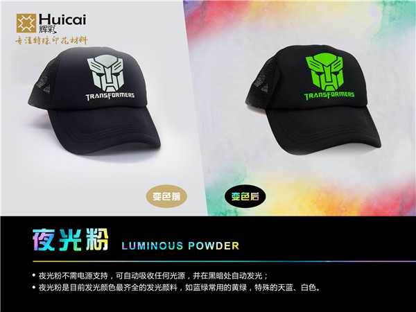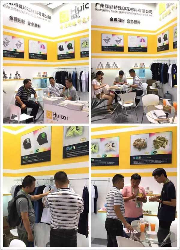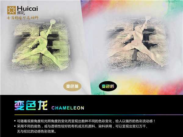 辉彩本次上海国际网印及数字化印刷展,温变粉、光变粉、夜光粉、变色龙、铜金浆等印花材料在整个展会脱颖而出,赚足了眼球
