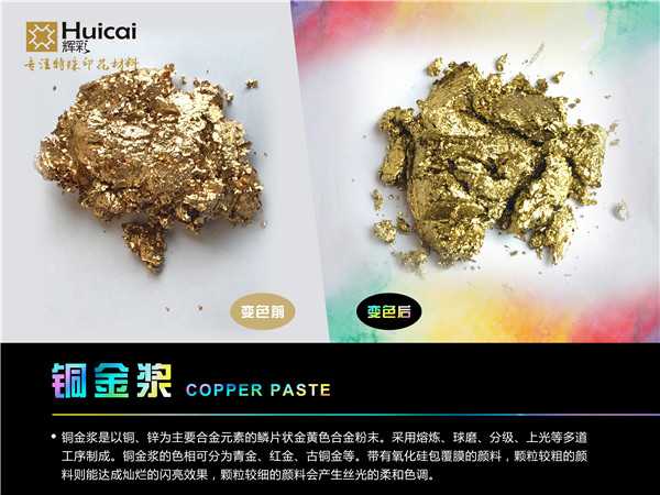 铜金浆已广泛应用于丝网印刷、涂料、织物印金、烫金材料、喷涂行业等行业,将铜金粉与调金油混合制成金墨及印花浆料,大量用于服装印花及外包装等。