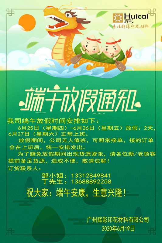 温馨提示:【辉彩公司】端午节放假时间为:6月25-26日、27号正常上班,放假期间,可照常接单,如需订货可联系:13312849841邹经理,祝大家节日安康!