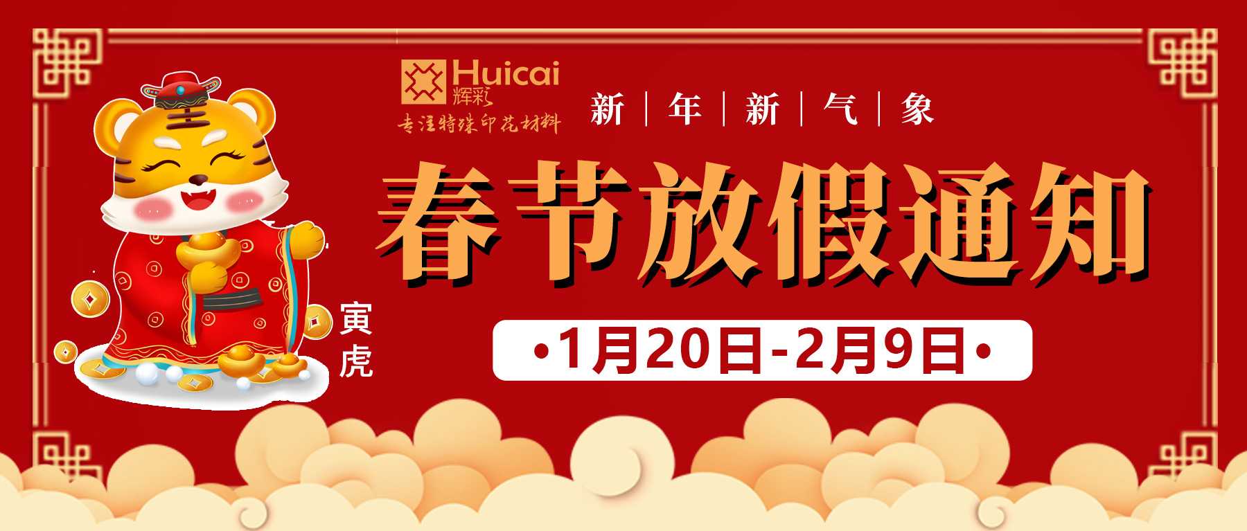 为了贵司在春节期间能正常的生产运作,特通知贵司,辉彩2022年春节假期定于2022年1月20日(农历腊月拾捌)放假,2022年2月10日(农历正月初十)正常上班发货。如需备货请于假期前确定下单订货,放假期间我司将暂停发货,请各新老客户提前备货,以免影响贵公司正常生产。如有不便,敬请谅解!