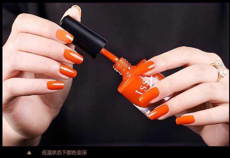 感温变色指甲油是由温变粉为原料加入到指甲油里做出来的,这种指甲油随着温度的上升和下降而来回变色的。温变指甲油临界变色温度是22度,温度升高了颜色就变浅了,甚至消失了;温度低颜色会变深。