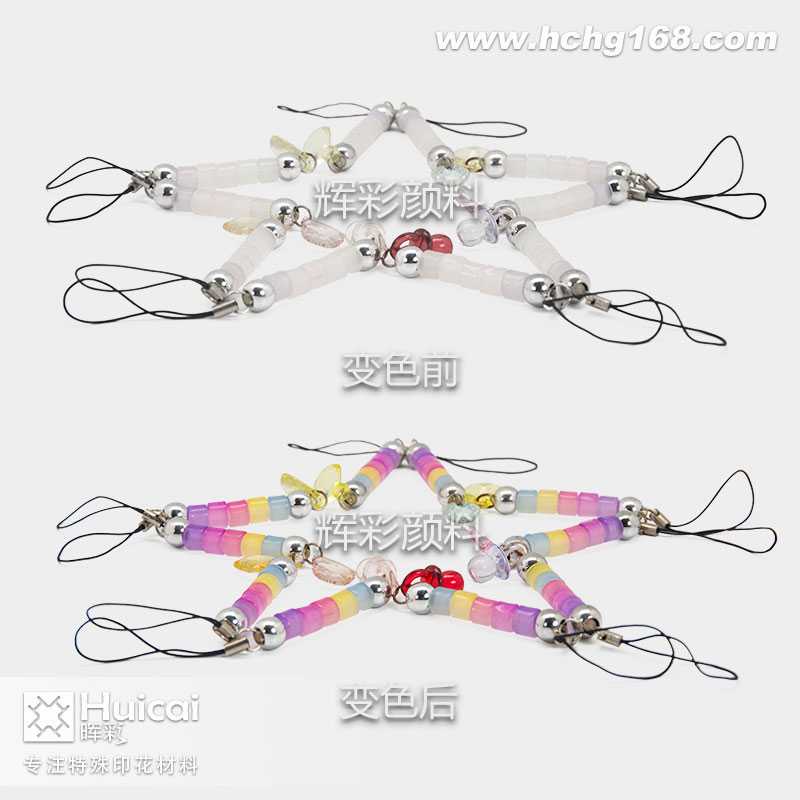 感光变色粉可应用于丝网印刷,产品的设计大多以在室内时室外时有颜色变化为诉求,并在多应用于紫外线强弱测试系列产品,也可做防伪设计使用。适用于各类塑胶PP、PVC、ABS、硅橡胶等材质的射出、压出成形塑胶产品,耐温度:180度。