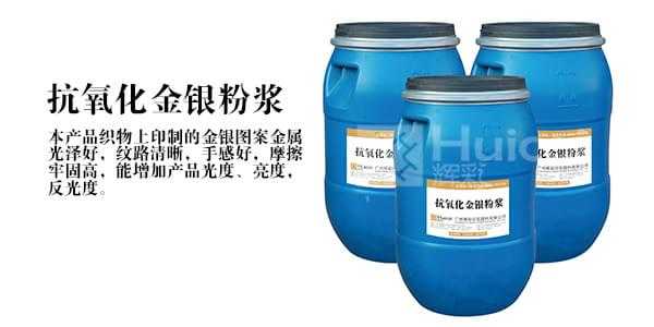 抗氧化金银粉浆亮度好,抗氧化力强,能增加产品的光度、亮度、反光度,同其他不抗化的金粉浆物品相比,抗氧化金粉浆的使用能使您的产品独特,从而为您打开销路。此产品适用于棉、涤、麻、尼龙等织物的印花,亦可用于真丝织物的小块面印花。使用本产品方法简便,直接与金、银粉按适当比例混合即可进行印花,网布上的使用性能优良。