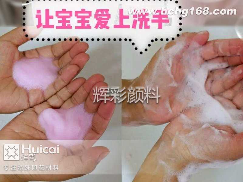 大家在洗手时,双手会不断摩擦发热从而产生温度的变化,或者是当我们在使用热水洗手时,泡泡也能感受到温度差,于是颜色就会根据温度的变化而变化。在生产过程中,给变色洗手液设定好了变色的温度值,当水温或者手温高于变色的温度值时,泡泡就会从一种颜色比如粉色变为另一种颜色比如白色,当低于变色温度时,洗手泡泡会恢复为之前的颜色。在孩子看来这种颜色的变色是非常具有新意的,能让他感觉到像魔法一样,从而让孩子喜欢上洗手。