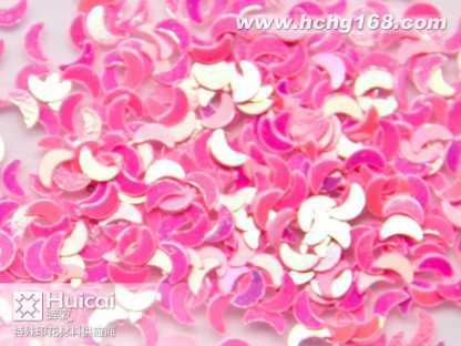 金葱粉:又名闪光片。包括铝质金葱粉,聚酯金葱粉,幻彩粉,镭射金葱粉等。有铝质,PET,PVC材质。大小规格(size)由1/256(0、1mm)至1/8(3、0mm)。形状有六角形,四角形,长条针形和不规则形状,并有多种颜色可供选择。各种材质金葱粉可不同程度承受高温(由80*C,180*C,300*C不等) 。
