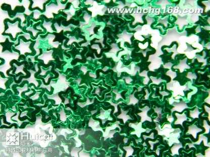 金葱粉:又名闪光片。包括铝质金葱粉,聚酯金葱粉幻彩粉,镭射金葱粉等。有铝质,PETPVC材质。大小规格(size)由1/25601mm)至1/830mm)。形状有六角形,四角形,长条针形和不规则形状,并有多种颜色可供选择。各种材质金葱粉可不同程度承受高温(由80*C180*C300*C不等) 。