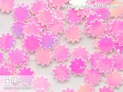 金葱粉:又名闪光片。包括铝质金葱粉,聚酯金葱粉,幻彩粉,镭射金葱粉等。有铝质,PET,PVC材质。大小规格(size)由1/256(0、1mm)至1/8(3、0mm)。形状有六角形,四角形,长条针形和不规则形状,并有多种颜色可供选择。各种材质金葱粉可不同程度承受高温(由80*C,180*C,300*C不等)