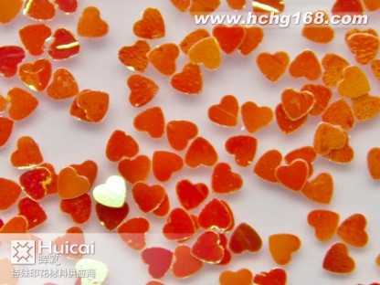 金葱粉:又名闪光片。包括铝质金葱粉,聚酯金葱粉幻彩粉,镭射金葱粉等。有铝质,PETPVC材质。大小规格(size)由1/25601mm)至1/830mm)。形状有六角形,四角形,长条针形和不规则形状,并有多种颜色可供选择。各种材质金葱粉可不同程度承受高温(由80*C180*C300*C不等) 。