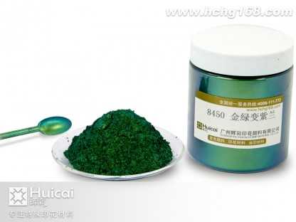 8450金绿变紫兰变色龙粉其变色原理为吸收特定波长之紫外光源,藉由该光源之能量而产生颜色变化(变为紫色、红色、黄色、天空兰色),当特定波长的紫外光源不在时,即恢复原来的颜色。
