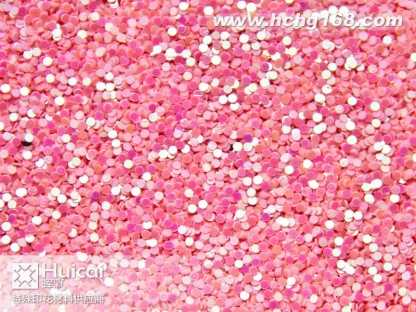圆形金葱粉:又名圆形闪光片。包括幻彩片,镭射片、金片和银片等。主要材质有PET和PVC两种材质。大小规格(size)由1.0mm至10.0mm)。形状规则为圆形状,并有多种颜色可供选择。各种材质金葱粉可不同程度承受高温(由80*C,180*C,300*C不等) 。